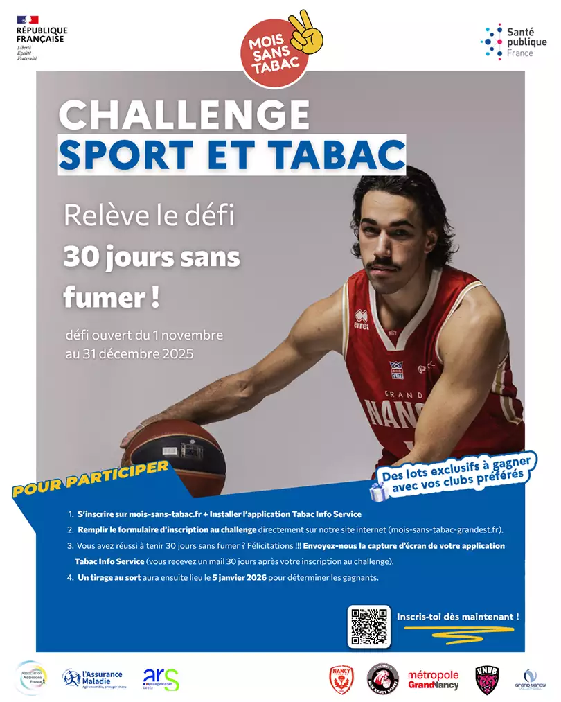 Le Mois Sans Tabac Grand Est vous propose un challenge : 30 JOURS SANS FUMER ! En partenariat avec les clubs de haut niveau du Grand Nancy.