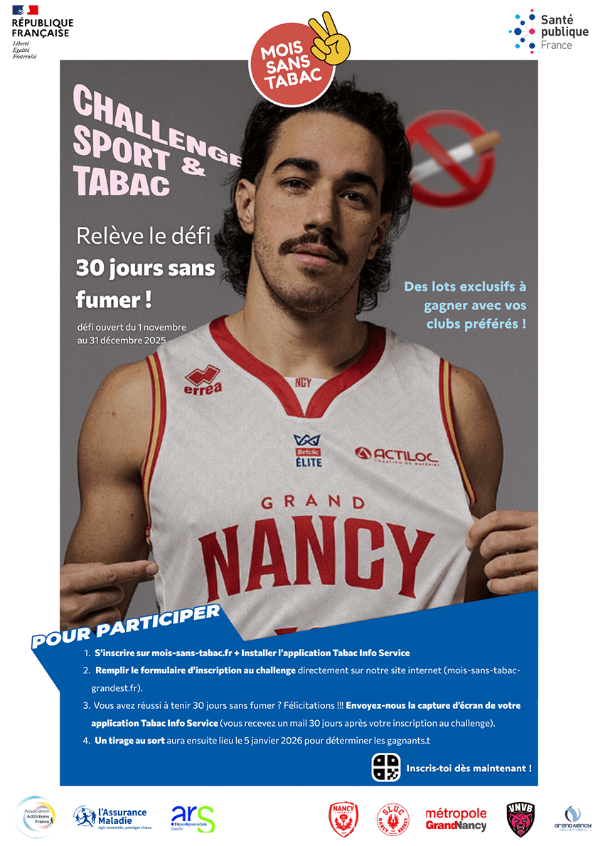 Organisé par le Mois Sans Tabac Grand Est et les clubs sportifs de haut niveau du Grand Nancy (SLUC, ASNL, GNVB et VNVB), le challenge Sport et Santé vous propose de relever le défi du Mois Sans Tabac pendant 30 jours pour tenter de remporter des lots, une session d'entrainement avec le club sportif de votre choix ou des produits dérivés des clubs partenaires.